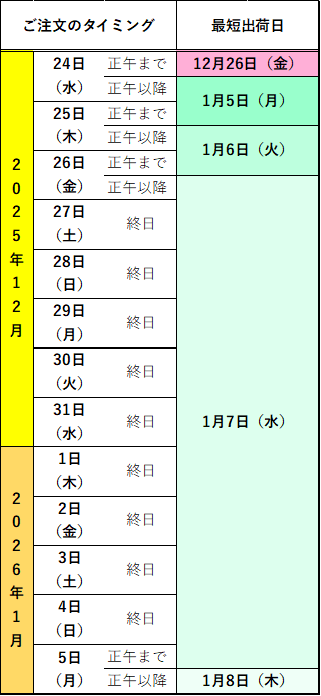 年内の出荷ご希望の場合は、2025年12月24日(水)正午までにご注文いただけますようお願いいたします。